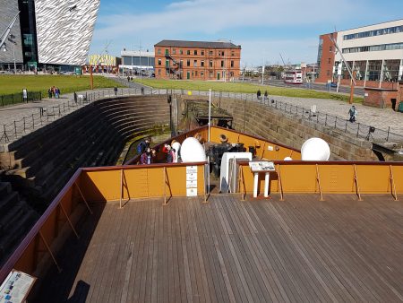 When we arrived at the Titanic Belfast Museum we met Giang and we took some photos together before we went into the museum. The museum had several floors and on the first floor we could learn a lot about the former linen factories in Belfast. In the other floors we could learn many interesting things about the Titanic and the shipyard that had built the Titanic, such as the construction of the Titanic, the life of a worker of the shipyard, how the Titanic sunk and much more. The name of the shipyard was Harland and Wolff and what I found very interesting was that the Titanic had two sister ships, the RMS Olympic and the HMHS Britannic.