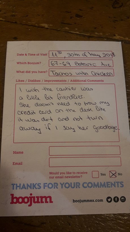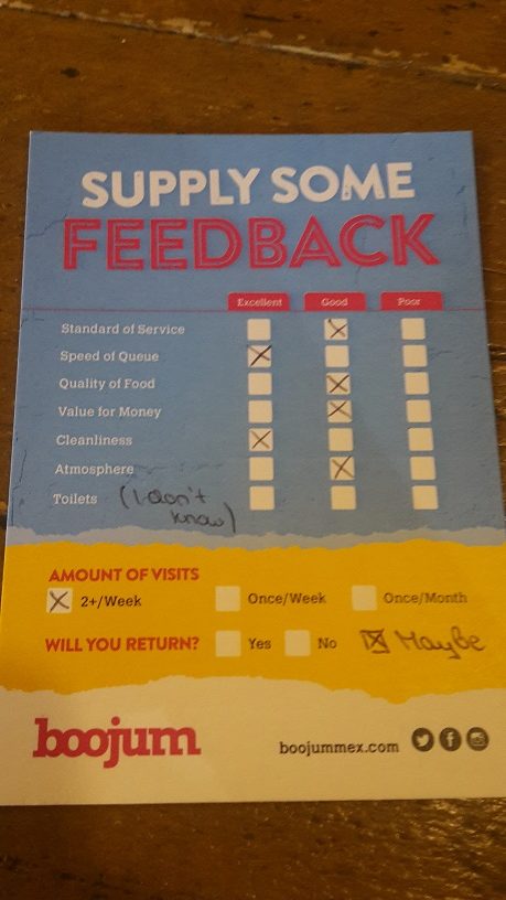 I became hungry and went to Boojum. It was the last taco maybe. To be honest, I could also disclaim it. The taco tasted old and not crispy. The cashier wasn’t friendly. She threw my credit card on the counter like it was dirt. And when I said her goodbye, she turned away. She needs to attend a seminar for customer service again. I was upset, so that’s I filled in the feedback sheet.