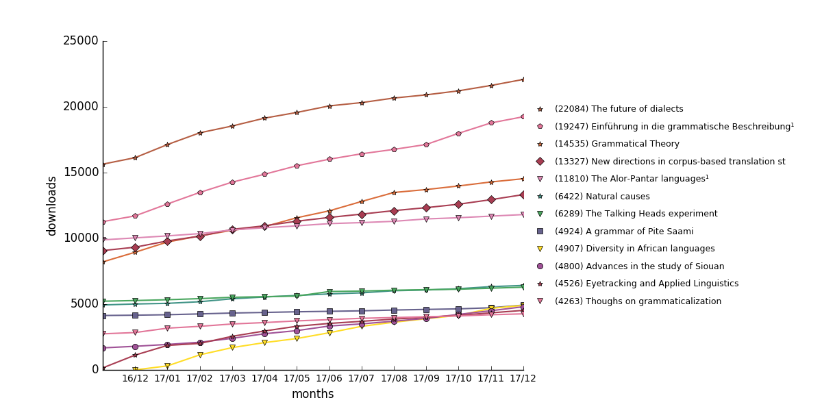 In 2017, LangSci pdfs have been downloaded 73,867 times (+13,282 compared to 2016) for a total of 174,775. This excludes downloads by search engine robots.