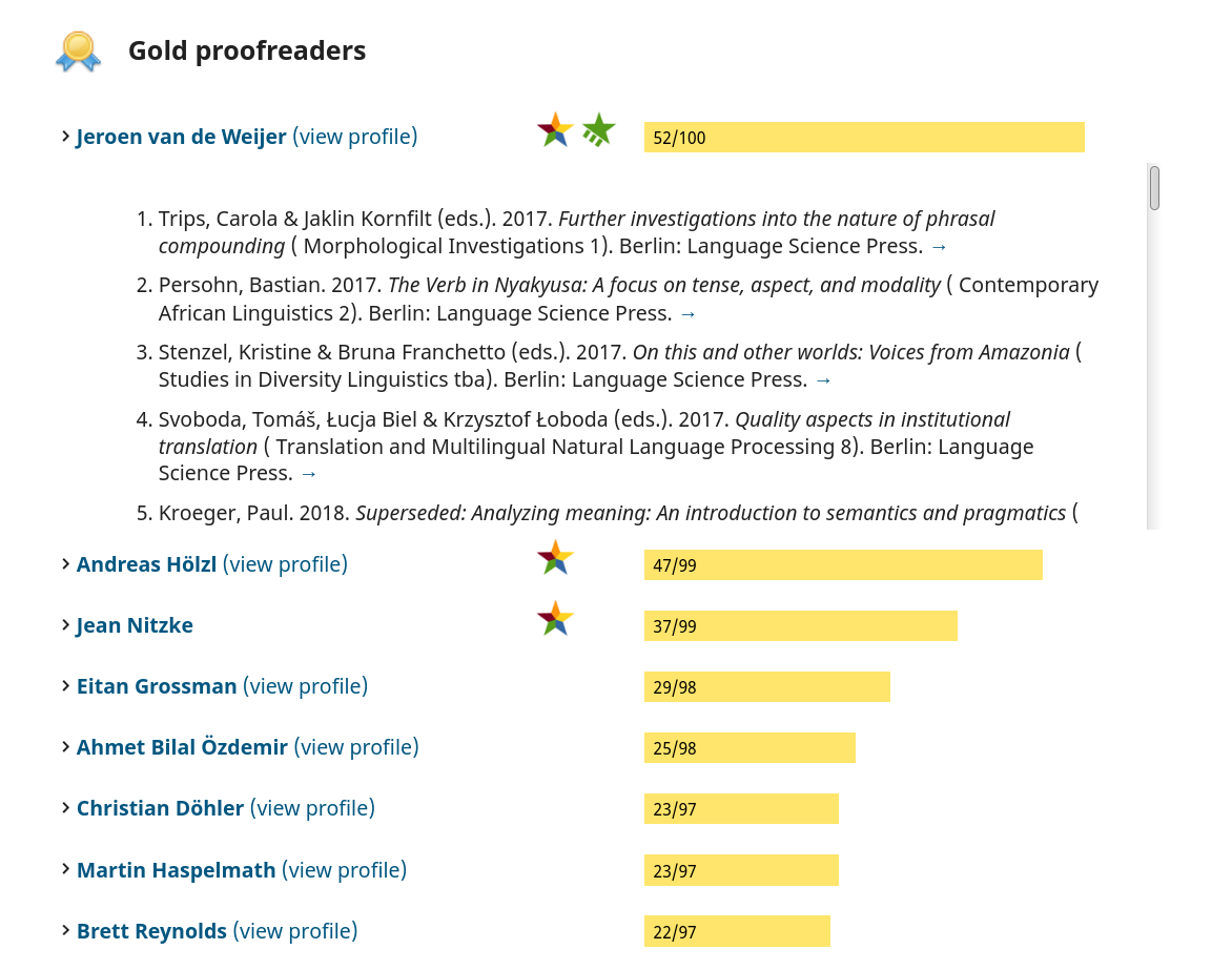 Language Science Press is a community enterprise. We rely on the community for authoring and reviewing, but also for typesetting and proofreading. Across all published books, 236 linguists from all over the world have participated in proofreading. The most prolific proofreader is Jeroen van de Weijer, who has proofread chapters of 70 books. There are currently 453 proofreaders registered with Language Science Press (+53).